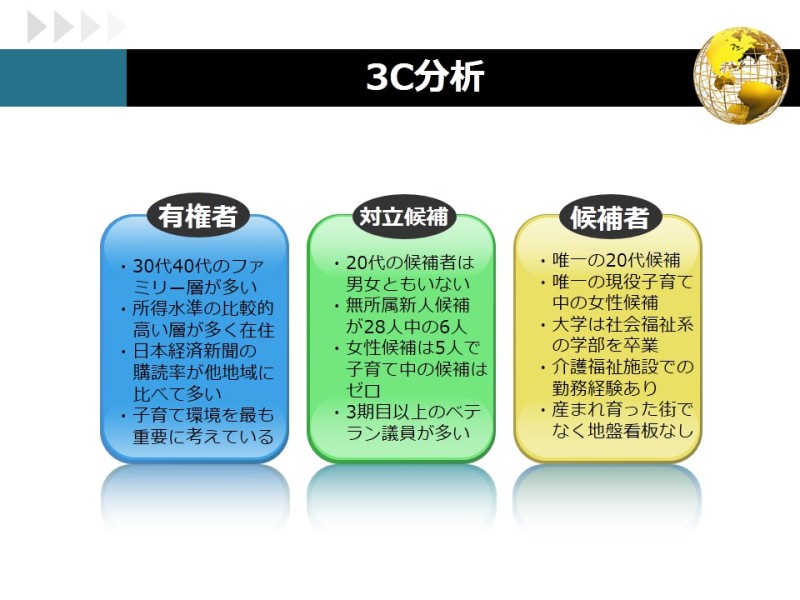 選挙に勝利するための戦略を構築するために、まずはこれら三つのフレームワークを実践して頂き、現在の自らのおかれた状況を把握することから始めてみてください。