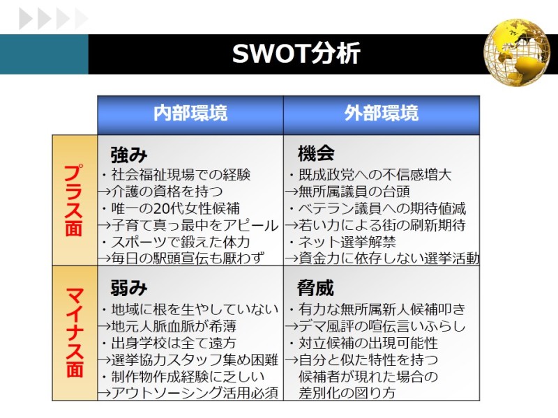 この軸で立候補選挙区の現状分析を行い、自分自身のリソースの棚卸しをします。